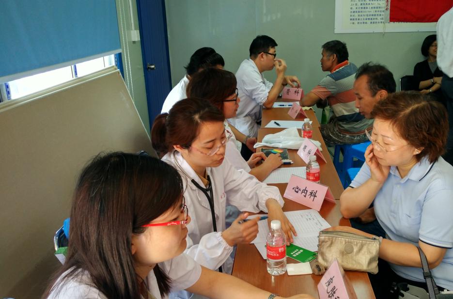 近期,上海持续高温,四行仓库修缮工程的收尾工作正在进行。7月31日上午,五建集团四行仓库项目部联合上海建工医院,在项目现场为100多名农民工进行义诊。建工医院呼吸科、内科、外科、骨科等各大科室的11名主任医师到场会诊,并为工人们普及了日常保健常识以及劳动保护小知识。在现场诊断中发现个别血压明显高于正常值或是心脏早搏的农民工,除建议其及时前往医院进一步诊治外,项目部也将及时调整其作业工种。