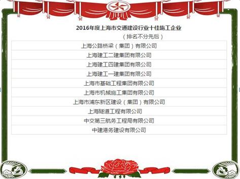 根据上海市城乡建设和交通委员会的相关工作要求,由上海市建筑施工行业协会组织开展上海市交通建设行业十佳施工企业评选活动。经对申报企业评审,评选结果网上公示等程序,最终确定10家企业被评为“2016年度上海市交通建设行业十佳施工企业”,上海建工一建集团、二建集团、四建集团、基础集团、机施集团等5家单位位列其中。本次评审旨在鼓励参与本市交通建设工程的施工企业认真履行社会责任,提高企业的综合实力和品牌形象,促进行业的健康发展。