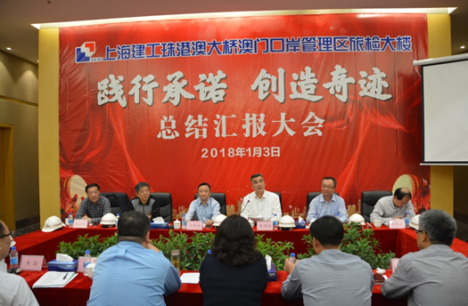 1月3日,集团召开港珠澳大桥澳门口岸旅检大楼工程“践行承诺 创造奇迹”总结汇报大会。集团党委副书记、总裁卞家骏,副总裁、旅检大楼项目总指挥蔡国强及集团参建单位领导、建设者代表等出席。 卞家骏表示,感谢项目部一年来辛勤的付出,完成旅检大楼的建设践行了年初的承诺,创造了“三年工期一年完成”的奇迹。充分发扬了集团“三大文化基因”;体现了“和谐为本,追求卓越”核心价值观;是集团全产业链联动集中实力的效应。