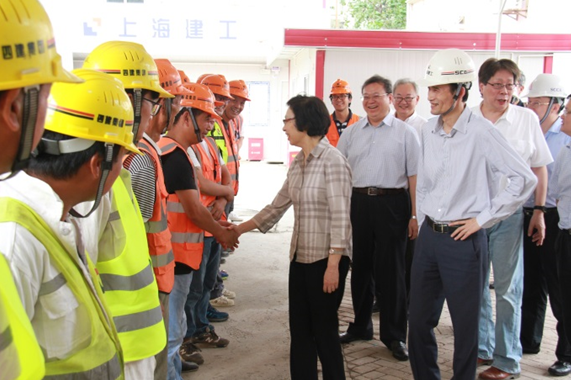 7月27日,市人大常委会主任殷一璀赴集团北横通道中山公园工作井及江苏路匝道工程和四建集团程十发美术馆新建工程,慰问工程建设者。市交通委副主任于福林,市文广局副局长王玮,城投集团党委书记、董事长蒋曙杰,集团副总裁、北横联合党委书记、总指挥蔡国强,集团副总裁、总经济师薛永申等出席。 殷一璀要求施工单位高度重视安全生产,落实好各项防暑降温措施,确保职工高温作业无后顾之忧。要合理安排作息时间、确保人员安全的基础上,切实加快工程进度,确保工程安全顺利完工。