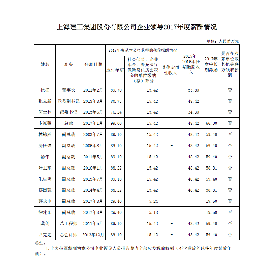 上海建工集团股份有限公司企业领导2017年度薪酬情况