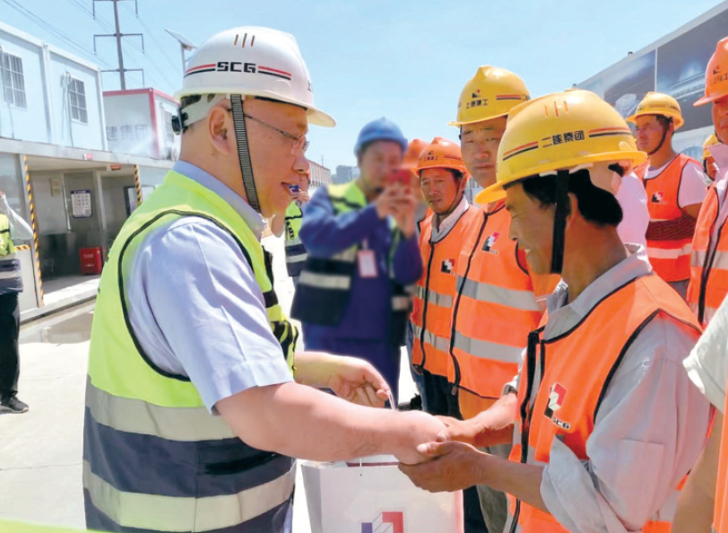 近日,高温频袭,集团党委书记、董事长徐征,监事会主席周平,党委副书记、总裁卞家骏,党委副书记张立新,纪委书记何士林,工会主席卞炯,副总裁林锦胜、汤伟、蔡国强、徐建东等领导和集团相关职能部门负责人分三路到集团承建的上海浦东足球场、特斯拉超级工厂项目(一期)、国展中心展览规模提升工程、闵行区新虹街道保税仓库等多个重大工程,看望在高温酷暑中仍然坚守一线辛勤工作、默默奉献的广大建设者,为他们送上防暑清凉用品,并向他们表示亲切的问候。 徐征代表集团对所有参建人员的辛苦付出表示感谢,对工程取得的成绩表示肯定。他强调,要借助科技的力量,使安全、质量等各项管理措施到位;要不辱使命,为上海和全国各地的城市建设作出贡献;各级领导干部“心中要有群众”,合理安排好建设者的作息时间,把夏季施工劳动保护和其他防暑降温措施落到实处;各单位要做好高温津贴的发放工作,各级工会要关心关爱职工并落实好、使用好防暑降温的各项费用。