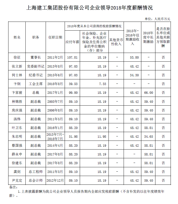 上海建工集团股份有限公司企业领导2018年度薪酬情况