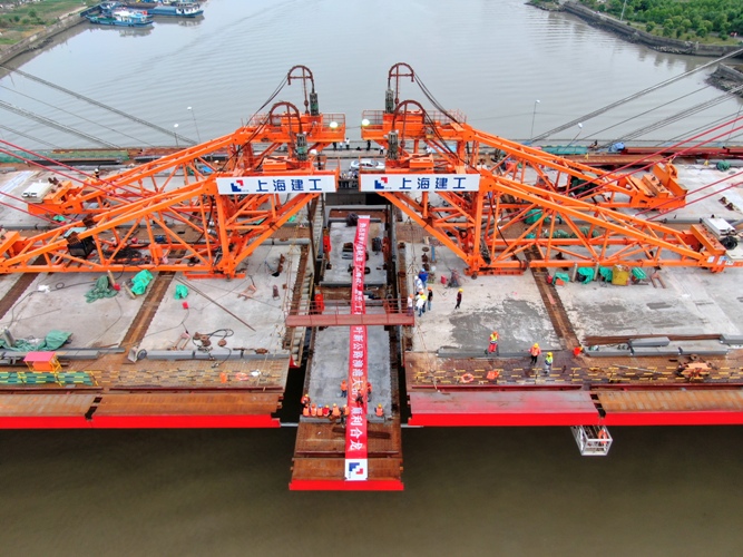 5月20日,基础集团承建的平申线航道(上海段)整治工程(叶新公路泖港大桥)主桥顺利合龙。曾经的“上海斜拉桥之母”,历经两年建设,重现于大泖港之上。主桥合龙后,将进入铺装和照明设施安装环节,预计2021年通车。 泖港大桥建成于1982年,为200米大跨度预应力砼斜拉桥,是上海造桥史上第一座大跨径斜拉桥,通车时是全国跨径最大的公路斜拉桥。它的建成,为以后上海乃至全国建设斜拉桥积累了宝贵的桥梁设计理念和丰富的施工经验,在中国的斜拉桥建设史上具有里程碑的意义,也为后来建设中国首座400米以上大跨径斜拉桥——南浦大桥奠定了基础。 新建泖港大桥全长1.39公里,一跨过河,主桥跨度445米。泖港大桥是拆除重建工程,新桥保留了老桥的曲线纹理和平行式斜拉索,但也有所不同。老桥是双塔双索面造型,远看犹如两面竖琴,设计婉约;新桥改为双塔中央单索面造型,远看变成两根直柱矗立,更加现代。考虑到车辆通行需求,新桥宽38.5米,是老桥12米的3倍有余,新桥建成后为一级公路,双向6车道及人行道、非机动车道。 在这次改建工程中,大桥不仅在外观上沿用了历史设计,连设计方市政总院和施工方基础集团,也都是老桥建设的主力军。 新桥与老桥的距离很近,甚至有2米与老桥重叠,成了这次建设的最大难点。原有施工计划是建成新桥后,再拆除老桥,现在又多了一步——先建设新桥的主体部分,再拆除老桥,最后将重叠位置的新桥建设完成。 在设计、施工中,采用了许多国内首创应用的新技术。如采用“卡尔曼滤波控制”理论,这是一种修正导弹飞行轨迹和解决宇宙飞船对接才用到的技术,它大大提高了施工的精确度,大桥合龙时,高度误差仅2厘米,首创应用了大吨位冷铸锚的工艺技术。