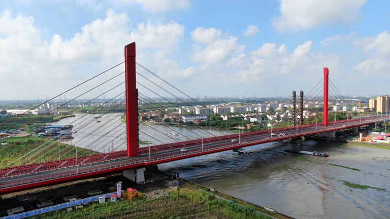 叶新公路泖港大桥工程位于上海市松江区泖港镇,线路为东西走向,新建泖港大桥于2018年4月动工,主桥一跨过河、采用钢塔钢箱梁平行单索面斜拉桥,塔梁固接、塔墩分离体系,主桥跨径445米,其中主跨225米,主塔高60米,主跨宽38.5米,为一级公路,双向6车道及人行道、非机动车道。