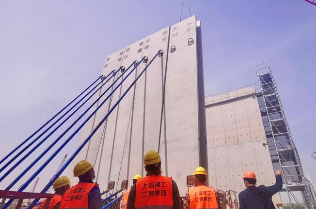 二建集团承建的竹园污水处理厂四期工程1.5标段项目PC试验区五榀双皮墙吊装近日顺利完成。该墙板由建材科技试制完成。 竹园污水处理厂四期工程位于浦东高东镇,其中1.5标段项目于2020年12月开工,预计在2022年12月底竣工。该标段主要建设部分包括新建70万立方米AAO生物反应池、平流式二沉池、雨水泵房、污水泵房、碳源投加间及标段范围内管道及箱涵等构筑物。其中AAO生物反应池缺氧池区域采用装配整体式结构。此次PC试验区五榀双皮墙吊装的顺利完成,是该项目预制构件深化试验工作的重大节点,同时也为今后主体预制装配式施工起到了重要的示范及指导作用。 据介绍,前期该工程预制结构设计经多方研究、深化,并召开多次专家会议,特邀参建单位及资深专家对预制装配式结构设计施工及相关试验进行研讨,最终确定选用“双皮墙+倒T板”装配式结构体系。该体系使用后,将总体实现整体结构的构件轻量化、节点形式简单化,达到施工便捷化的深化目标。主体结构正式施工前,项目部于现场进行1:1模型足尺试验区施工,通过试验区施工过程及后续载荷试验,来验证施工工艺及设计方案的合理性。此次PC试验区双皮墙构件高8.4米,重7.155吨。 |