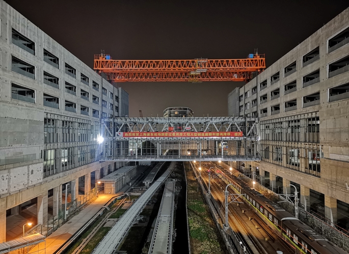 集团承建的上海浦东国际机场三期扩建工程旅客过夜用房北连廊于近期完成了全国首例横跨磁悬浮与地铁的钢连廊提升、滑移、下降落架。 该项目需建造连接东西两栋过夜楼之间的南北两条连廊,建造好的连廊坐落于磁悬浮与地铁2号线上方。由于现场工况限制,无法在磁悬浮与地铁2号线轨行区内设置吊机停机位,也无法在过夜楼各区域内满足南北连廊的安全吊装。为此,参与施工的机施集团项目团队在楼前高架上整体拼装钢连廊,在东西两侧楼顶铺设龙门行走轨道,同时将轨道延伸至高架上方,并对架桥机进行全面改造,使其成为大跨度整体可移动提升平台。采用计算机控制钢结构整体提升、下降技术,使连廊整体提升浮空,将提升平台连同连廊,一同滑移至安装位置,再进行整体下降。在磁悬浮与地铁2号线不停运、不断交的前提下,完成了北连廊钢结构整体提升、滑移、下降的工程实施。 旅客过夜用房北连廊跨度约49米、高度约12米、宽度约24米,用钢量约387吨。为减少轨行区内的安装与动火作业,在提升前现场已完成钢结构框架拼装与焊接、压型板铺设与栓钉焊接、外立面幕墙钢龙骨与焊接、三条检修马道安装与焊接、连廊反底外露钢结构防火涂料与面漆等工作。机施集团采用自主研发的计算机同步控制系统,配合传感器的负载反馈,实现了整体下降过程的毫米级精度控制及载荷的平稳转换,保障了结构高精度、高质量的自动化整体安装。施工期间,项目部联合磁浮公司、申通公司的相关部室成立领导小组,严格遵守领导带班制度,建立管理组织架构,精心部署各条线各岗位的工作职责并落实到平面图上的各个位置,保持信息畅通,白天2小时报备一次,夜间1小时报备一次,实施过程中确保万无一失。 |