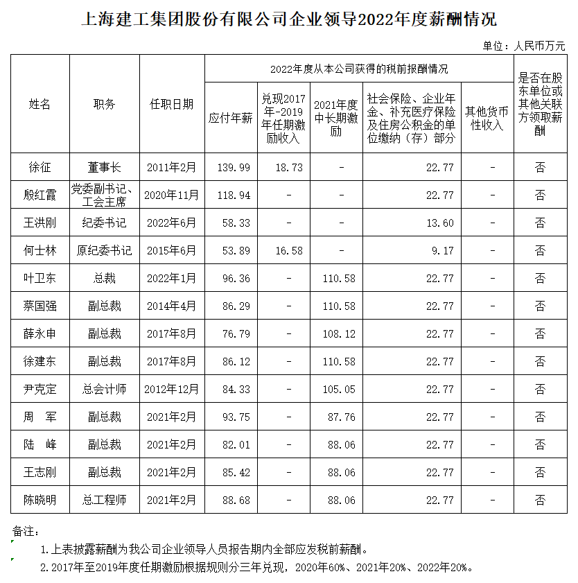 上海建工集团股份有限公司企业领导2022年度薪酬情...