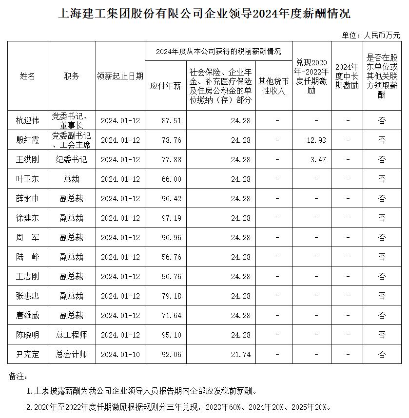 上海建工集团股份有限公司企业领导2024年度薪酬情况