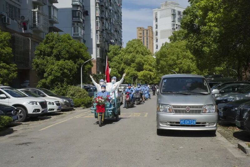 既然走不了,那就一起留在社区做志愿者吧。 近日,宝山区顾村镇采菊苑(防范区)小区内,90后党员志愿者王佳亮和龚逸忱举办了一场简单而特殊的婚礼。 新郎没有穿上帅气的西装,新娘也没有披上洁白的婚纱,取而代之的是两人统一的全套防护服加佩戴党徽的搭配。自参与社区志愿服务以来,这是两位新人再熟悉不过的装束,也是他们对这段特殊时期的纪念。“白底蓝边的‘大白’比婚纱还漂亮,对我们而言,这是一个意义非凡、终生难忘的婚礼!” 新郎王佳亮出生于1993年,是上海建工五建集团第三工程公司的一名工作人员,新娘龚逸忱出生于1995年,是彩虹幼儿园的一名教师。今年3月23日原本是他们回崇明岛举办婚礼的日子。就在两人请好假准备回去的那天,社区实行封控管理的消息传来。乐观的他们没有多想,马上消化了婚礼要延期举行的情况,还共同作出决定——既然走不了,那就一起留在社区做志愿者吧。 两位年轻人的加入让社区志愿服务团队更有力量。怀着“哪里需要就去哪里”的想法,他们参与了多个岗位的服务。社区核酸采样时,他们主动配合医护人员,帮忙搭棚、抬桌子,为不会使用智能手机的老人生成、打印检测码。快递运送组缺人,他们就赶到门口,帮着一起分拣、运送到居民楼栋口,遇上老人腿脚不便不能下楼,他们便主动送货上门。过去的一个月来,除了线上办公和休息的时间,两人几乎全情投入志愿服务,收获了社区居民的一致好评。 4月的一天,两人在服务时无意中提到了原本要举办的婚礼,一旁的志愿者听后,暗暗记下了这件事。按照全市实施的分区分类差异化防控,采菊苑划定为防范区,经过与上级管理部门的报备、征询,居委和志愿者们决定一起准备一个惊喜——为两人筹备一场社区婚礼。 因为保密工作做得好,小王和小龚一直没有察觉到伙伴们的“暗中行动”,直到一切都准备妥当,大家才把这个喜讯告诉他们。顾村镇总工会准备了手工编织的胸花和床上四件套作为爱心贺礼,居委更是送上了筹备多日的一本新婚祝福册。居委干部表示,这本册子上写满了百余户居民签名的“新婚快乐”“永结同心”“百年好合”等祝福语,都是居委社工和志愿者们在平日服务中一点点收集来的。“大家都为这件喜事感到特别高兴!” 婚礼当天,在严格按照防控要求的前提下,身穿“大白”的新人乘坐一辆两人都非常熟悉的平时运送物资的三轮车“婚车”,与身后身穿“小蓝”的送货志愿者电动车队一起绕小区兜了一圈,随后来到一个空旷的平地,致谢辞、交换戒指。双方父母和亲朋好友则通过手机视频连线,“云出席”了这场婚礼,送上新婚祝福。 尽管婚礼只持续了短短十来分钟,但两位新人感慨万分:“看到那么多人把我们的事放在心上,送来各种各样的关心祝福,我们真的非常感谢,非常感动!接下来,我们还是会继续坚守岗位,与大家一起守护我们的美丽家园。”
