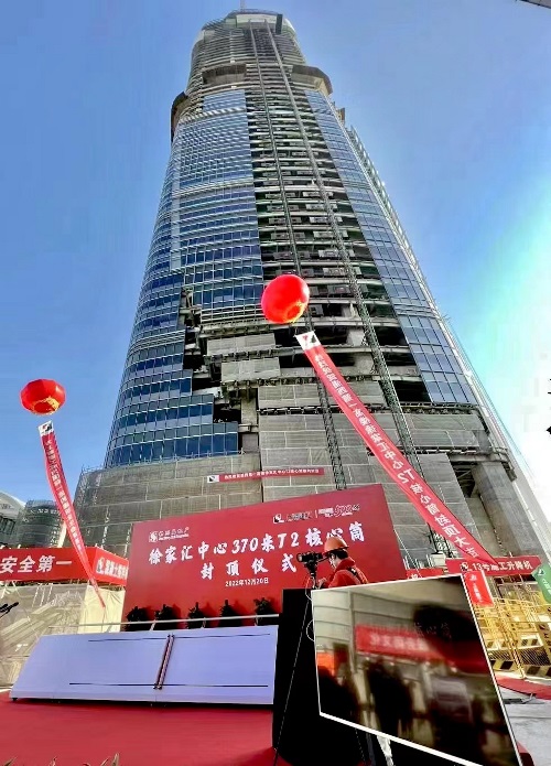上海浦西在建最高楼取得重要进展。 由上海建工集团总承包、集团总承包部组织实施中的上海又一大型综合体项目徐家汇中心(虹桥路地块)工程建设不断加快,其中的上海浦西在建最高楼、高370米的T2塔楼核心筒12月20日上午顺利实现封顶目标。 徐家汇中心(虹桥路地块)处于上海市徐家汇商圈的核心地带,总建筑面积约80万平方米,包括已落成的高220米的T1塔楼和建设中的高370米的T2塔楼等2栋超高层办公楼,以及1座高层酒店、7层商业裙房和6层地下室。由于该项目建筑体量大,因此结合项目实际建设进度,上海建工集团工程总承包项目团队在组织实施中采用分批验收的方式,对具备条件的T1塔楼已于今年7月26日先行竣工验收,为业主新鸿基地产后续的招商投用提供保障。 今日实现核心筒封顶的高370米的T2塔楼,建筑面积24万平方米,单层面积约3700平方米。该工程在建设过程中对周边环境保护要求苛刻,工程与运营中的地铁11号线车站为“零距离”,与9号线隧道最近距离为10米,需要确保地铁运行的绝对安全。此外,工程还紧邻交通繁忙的虹桥路和宜山路,道路下重要管线密集,施工中稍有不慎,易造成煤气泄漏等公共安全事件的发生。 面对超深、超高、超复杂难题,上海建工集团总承包部协同一建集团、基础集团、机施集团、安装集团和装饰集团等,将先进的BIM技术和独创的自动监控系统等应用于工程建设之中,确保工程建设对周边环境的影响降到最低。今年以来,建设者全力克服疫情、夏季连续高温等带来的困难,终于实现了T2塔楼核心筒封顶目标。