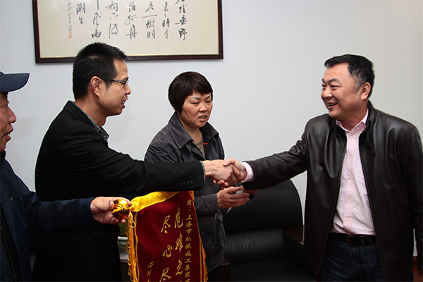图为李阿婆的儿子(左二)为机施集团送来锦旗。